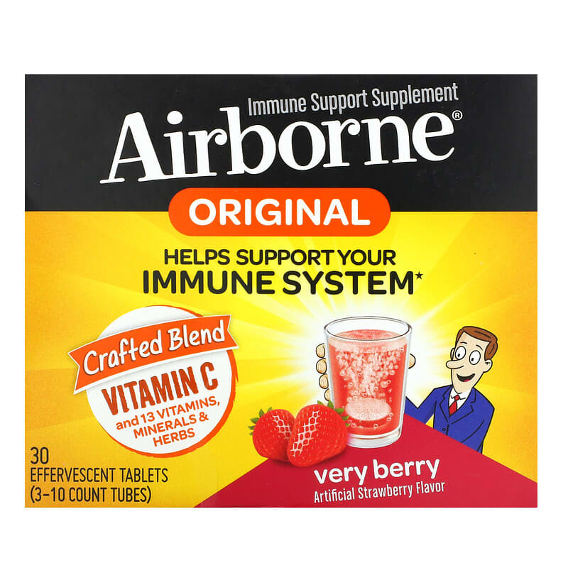 Helps Support Your Immune SystemCrafted Blend – Vitamin C and 13 Vitamins, Minerals & HerbsArtificial Strawberry FlavorHealth – Hygiene – HomeOur StoryDeveloped by a former school teacher, AIRBORNE® products are a specially crafted blend of vitamins, minerals, & herbs designed to help support your immune system. 1 Effervescent Tablet =1, 000 mg of Vitamin CHigh in Antioxidants (Vitamins A, C & E)Excellent Source of Zinc & Selenium350 mg Herbal Blend including Echinacea & GingerGluten Free