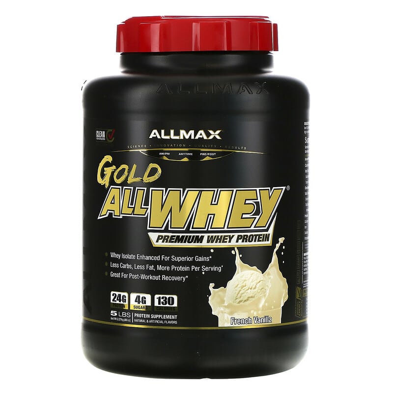 Amazing New Taste! Science – Innovation – Quality – Results AM/PM – Anytime – Pre/Post 80 Percent Protein Premium Isolate/Whey Protein Blend 100% Whey Protein Source Primary Source: Whey Protein Isolate Lab Tested & Certified, Guaranteed 24 g Protein – 2 g Sugar – 120 Calories Protein Supplement Natural & Artificial Flavors Tested Free of Banned Substances Informed-Choice – Trusted by Sport Lab Tested – Every Ingredient – Every Lot CGMP Certified Facility Gluten Free Kosher DairyAllWhey Gold: Best Tasting Whey We’ve Ever MadeAllWhey Gold is an Ultra-Premium Whey Protein Isolate and Whey Protein Concentrate Blend with 24 g Protein in a 30 g serving; that’s an 80% yield! AllWhey delivers a clean, complete and whole protein that has been sourced from 100% whey protein with zero aminos added. Demand low carbs, low fat and low sugar. With unmatched Taste and Quality like this, you have to demand Ultra-Premium AllWhey Gold!Premium Protein, Premium TasteNew Premium AllWhey Gold is by far the Best tasting AllWhey we’ve ever made! We tested over 50 versions and selected only the best, most amazing flavors. Using a completely New cutting-edge flavor technology our AllWhey flavors will make you think you just had a freshly-blended Ice Cream Milkshake. Easy to mix and even easier to drink, AllWhey fits your fit lifestyle!Unmatched ResultsAllWhey Gold features reduced lactose (milk sugar) protein; ideal for individuals sensitive to lactose in other protein drinks. AllWhey has non-denatured intact whey protein fractions that further support protein absorption and utilization. AllWhey is formulated with enzymes that enhance digestion and result in higher levels of absorption and ultimately help you better utilize the protein you consume. AllWhey Gold delivers an ultra-high quality whey isolate-concentrate protein blend to help rebuild your muscles after intense training. Research shows that higher protein levels following your workout help muscles recover faster. Better protein, better results!Unsurpassed AllMax Quality GuaranteedEvery ingredient added and every lot produced is laboratory-tested for purity and potency to ensure consistent product quality and integrity every time, guaranteed. 3rd Party Tested – Free of Banned SubstancesAllWhey has been tested by an Independent 3rd Party Laboratory for Banned Substances. Protein Comparison