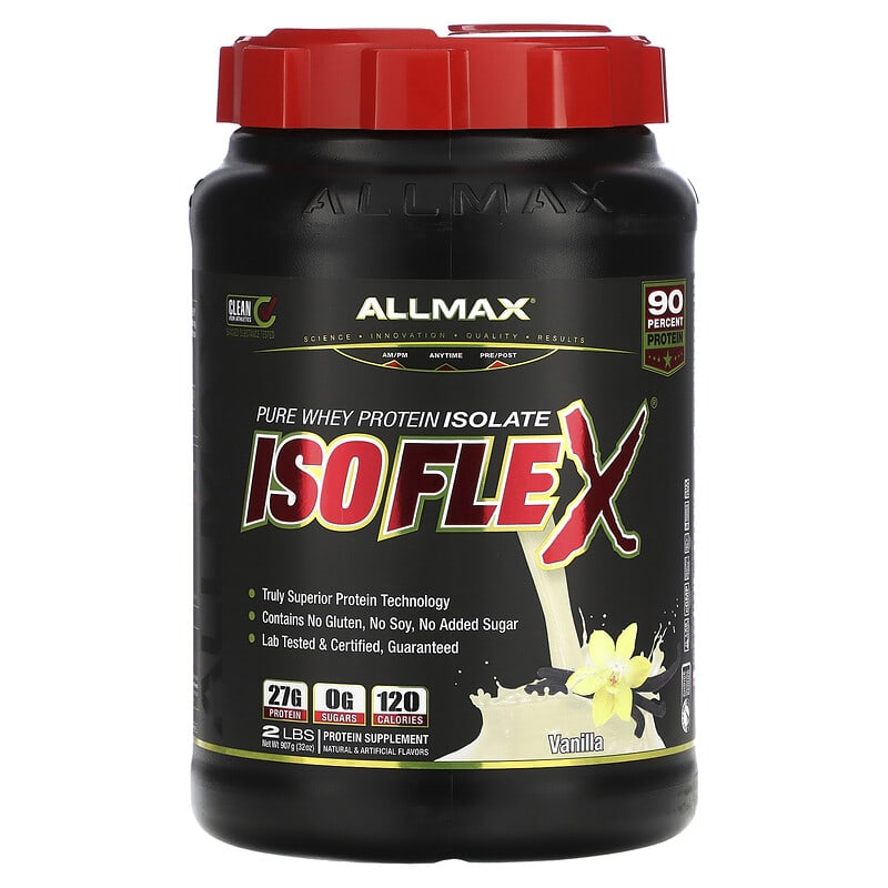Clean for Athletes – Banned Substance TestedScience – Innovation – Quality – ResultsAM/PM |Anytime | Pre/Post90 Percent ProteinPure Whey Protein IsolateTruly Superior Protein TechnologyContains No Gluten, No Soy, No Added SugarLab Tested & Certified, Guaranteed27 g Protein – 0 g Sugars – 120 CaloriesProtein SupplementNatural & Artificial FlavorsInformed Choice – We Test You TrustRegularly Tested for Banned SubstancesLab Tested – Every LotcGMP Certified FacilityGluten FreeKosher DairySoy-Free100% Whey Protein IsolateSweetened with Acesulfame Potassium & SucraloseNative & Intact – Non DenaturedIsoflex: Truly Superior ProteinIsoflex® has taken WPI technology to a whole new level of measurable superiority. Isoflex® is significantly lower in lactose, fat, sugar and carbs, compared to regular WPIs. If you’re looking for the highest quality, most premium and fastest absorbing protein, then look no further than Isoflex®; a Truly Superior Whey Protein Isolate. In just about every way a protein can be, Isoflex® Is Truly Superior. What Does This Mean To You?A 100% Whey Protein Isolate SourceNative & Intact, Non-Denatured Whey Protein FractionsLaboratory-Tested, Certified & Approved 27 g Pure Protein In Every ServingHybrid Ratio Isolate – (HRI) – Ion-Filtration TechnologyIsoflex® employs a unique protein extraction technology called HRI. A hybrid of two isolate purification technologies incorporated at a specific ratio to produce a truly superior ultra-pure Whey Protein Isolate. Cutting Edge Hybrid-Ratio Ion-Filtration (HRI) Technology allows Isoflex to retain an exceptionally high protein yield while maintaining enhanced bioactive whey fractions. Isoflex contains absolutely no Whey Concentrate. Concentrates have higher levels of fat and sugars with a lower percentage of protein and lower bioavailability than isolates. While other brands use Concentrates, Isoflex users know that Isolates have a superior protein percentage and won’t settle for non-Isolate blends. Unsurpassed: The Allmax® Quality GuaranteeEvery ingredient added and every lot produced is laboratory-tested for purity and potency to ensure consistent product quality and integrity every time, guaranteed. Clean for Athletes, Banned Substance Tested. This product has been skip-lot tested for banned substance for the assurance of athletes and supplement users under the Informed Choice program.