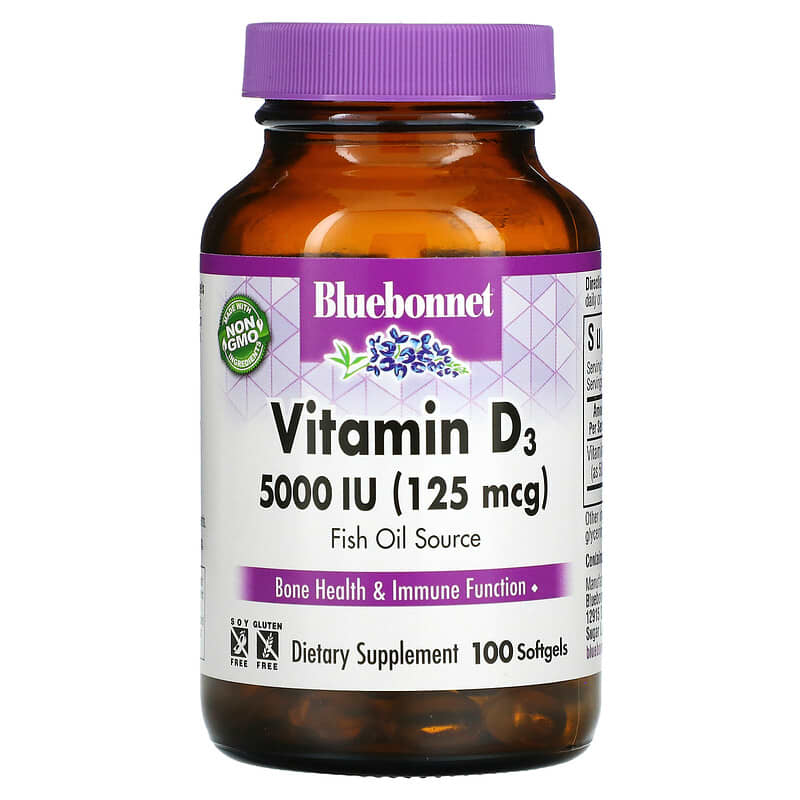 Made with Non GMO IngredientsFrom Fish OilMay Support: Bone Health & Immune Function Dietary Supplement Soy FreeGluten FreeBluebonnet’s Vitamin D3 5000 IU (125 mcg) Softgels are formulated with vitamin D3 (cholecalciferol) that supports strong healthy bones and immune function from molecularly distilled, deep sea, cold water fish liver oil in a base of non-GMO safflower oil.
