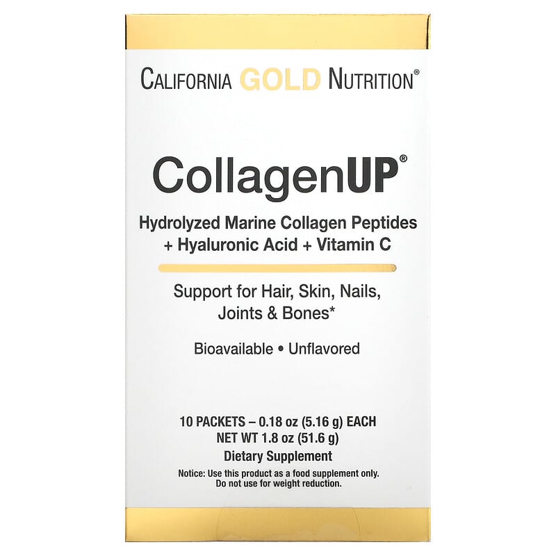 California Gold Nutrition CollagenUP PacketsMarine Sourced Collagen Peptides + Hyaluronic Acid + Vitamin CFeaturing Unflavored, Non-Bovine, Hydrolyzed Fish Collagen With Non-Animal Source Hyaluronic Acid and Vitamin CUpgraded Support for Healthy Hair, Skin, Nails, Joints and Bones*Enzymatically Hydrolyzed Collagen Broken Down into Bioavailable Peptides Formulated without Gluten, GMOs, or Soy Produced in a 3rd Party Audited cGMP Registered (Certified) Facility100% Gold Guarantee