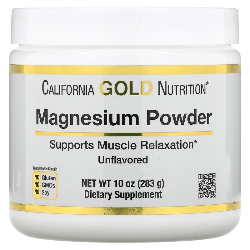 California Gold Nutrition BEVERAGES Magnesium PowderAvailable in Orange & UnflavoredMay Support Muscle Relaxation*Formulated to Contain: No Gluten, No GMOs, No SoyProduced in a 3rd Party Audited cGMP Registered (Certified) Facility100% Gold Guarantee