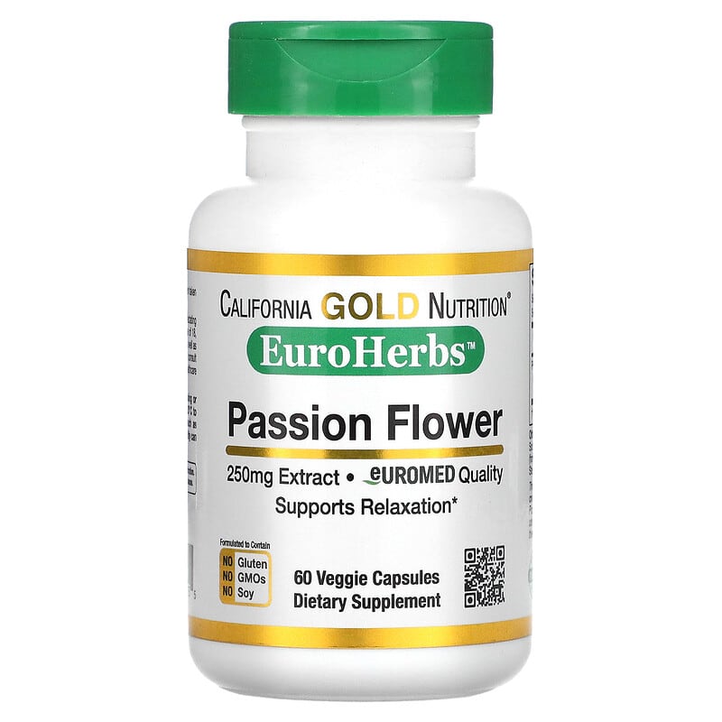 California Gold Nutrition®️ EuroHerbs™ Passion FlowerPhyto-Proof® EuroMed QualitySupports Relaxation*Standardized to 3. 5% FlavonoidsPassion Flower Origin France / Processed in SpainGreen Veggie Capsules Made with Chlorophyll Formulated to contain: No GMOs, No Gluten, No SoyProduced in a 3rd Party Audited cGMP Registered (Certified) Facility 100% Gold Guarantee