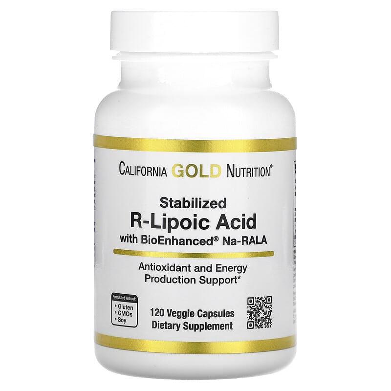 California Gold Nutrition Stabilized R-Lipoic Acid100 mg of R-Lipoic Acid from Bio-Enhanced® Na-RALA Sodium R-Alpha LipoateFormulated with Biotin to Help Promote Healthy Metabolism of Glucose and Fatty Acids* Suitable for Vegetarians and VegansProvides Antioxidant and Energy Production Support*No Gluten, No GMOs, No Soy 100% Gold Guarantee