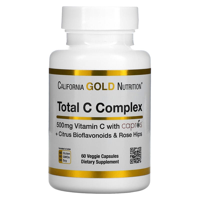 California Gold Nutrition Total C Complex 500 mg Vitamin C with Capros® + Citrus Bioflavonoids & Rose Hips Antioxidant & Immune System Support* Formulated to Contain: No Gluten, No GMOs, No Soy Produced in a 3rd Party Audited cGMP Registered (Certified) Facility 100% Gold Guarantee