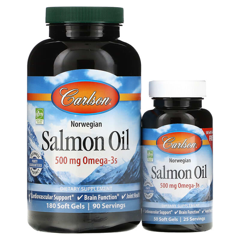 Igen Non-GMO Tested500 mg Omega-3sFreshness & Potency Purity GuaranteedDietary SupplementCardiovascular SupportBrain FunctionJoint HealthCarlson Providing the Finest Norwegian Omega-3s Since 1982Gluten-FreeNo Artificial PreservativesPurity GuaranteedIFOSAn FDA Regulated FacilitySalmon is some of the best fish we can get through our diet. However, most of us don’t eat enough salmon weekly to obtain the recommended amount of omega-3s, which is why a supplement can be a great option. Each serving of Norwegian Salmon Oil provides 500 mg of omega-3s, including EPA and DHA, which support heart, brain, vision, and joint health. Purity GuaranteedThis product is regularly tested by independent FDA registered laboratories. It has been determined to be fresh and fully potent (per AOCS international 25. protocols) and is free of detrimental levels of mercury, cadmium, lead, PCBs and 28 other contaminants.