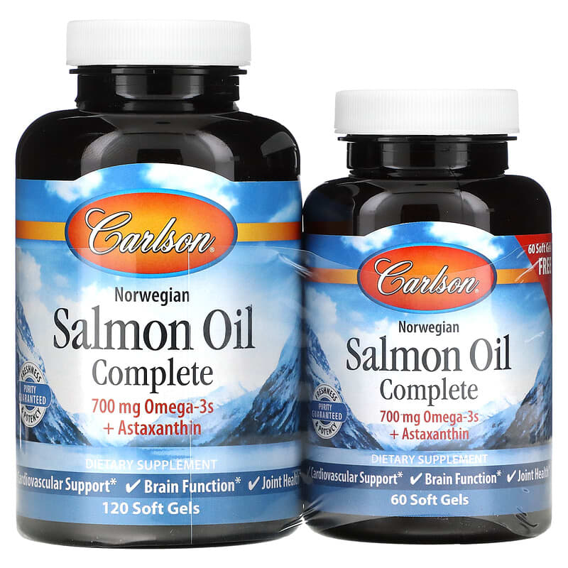 Freshness & Potency – Purity Guaranteed700 mg of Omega-3s with Astaxanthin Dietary Supplement Cardiovascular SupportBrain FunctionJoint HealthGluten-FreeNo Artificial PreservativesAn FDA Regulated FacilityCarlson – Providing the finest Norwegian omega-3s since 1982Salmon Oil Complete provides 15 different fatty acids, including omega-9, omega-7, omega-6, and the important omega-3s EPA and DHA. It also naturally contains astaxanthin, which gives salmon its pink color, helps preserve freshness, and plays an important role in fighting free radicals.