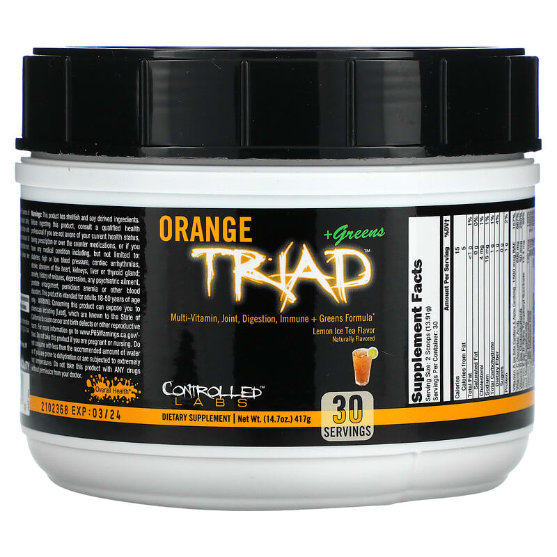 Citric acid, natural flavors. Contains: Shellfish (shrimp, crab &/or lobster), soy, wheat, tree nuts (ginkgo nut). Allergen warning: Manufactured on equipment which processes products containing milk, egg, wheat, soybeans, shellfish, fish oil, tree nuts, and peanuts. Cách sử dụng Take 2 scoops, per day, mixed in 8-16 ounces of cold liquid with whole food meals. Take this product daily. Orange Triad + Greens™ should be used in conjunction with other Controlled Labs products, with an adequate amount of water per day, and a high protein/moderate carbohydrate diet. Lưu ý This product has shellfish and soy derived ingredients. Before ingesting this product, consult a qualified health professional if you are not aware of your current health status, taking prescription or over the counter medications, or if you have any medical condition including, but not limited to: diabetes, high or low blood pressure, cardiac arrhythmias, stroke; diseases of the heart, kidneys, liver or thyroid gland; anxiety, history of seizures, depression, any psychiatric ailment, prostate enlargement, pernicious anemia or other blood disorders. This product is intended for adults 18-50 years of age only. Consuming this product can expose you to chemicals including [Lead], which are known to the State of California to cause cancer and birth defects or other reproductive harm. Do not take this product if you are pregnant or nursing. Do not consume with less than the recommended amount of water or if you are prone to dehydration or are subjected to extremely hot temperature. Do not take this product with any drugs without permission from your doctor. Keep out of the reach of children and pets. Do not purchase if safety seal is broken.