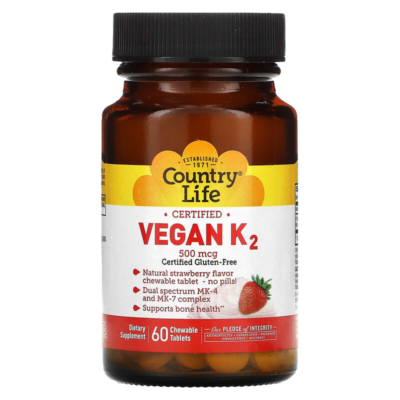 Established 1971Certified Gluten-FreeNatural Strawberry Flavor Chewable Tablet – No Pills!Dual Spectrum MK-4 and Mk-7 ComplexSupports Bone Health Dietary Supplement Certified B Corporation – Our Pledge of Integrity – AuthenticityCleanlinessFreshnessConsistencyAccuracyEmerging research shows that Vitamin K2 aids in bone formation. For optimal bone health, include vitamin K along with calcium and vitamin D. Country Life uses a dual spectrum vitamin K2 complex including 400 mcg of MK-4 as well as 100 mcg MK-7. This delicious, chewable tablet makes taking supplements easier than ever – no pills to swallow, no need for water. YESCertified Gluten-Free by GFCO. org