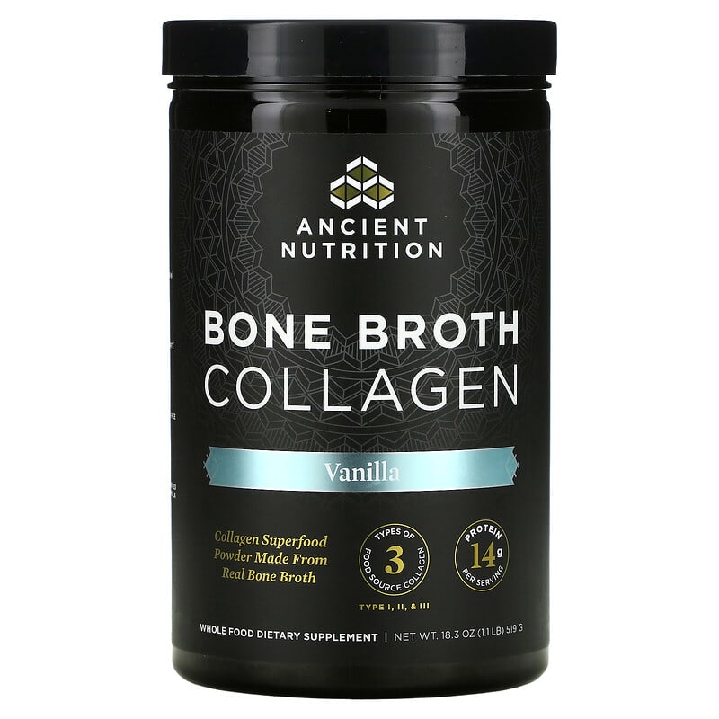 Collagen Superfood Powder Made from Real Bone Broth3 Types of Food Source Collagen – Type l, ll, & lll14 g Protein Per ServingWhole Food Dietary Supplement Skin JointsGMO FreePatented FormulaAncient Nutrition provides what our modern world doesn’t: easy access to simple, whole food nutrients that promote health, strength, and vitality. Formulated with 3 types of food source collagen to support healthy skin and jointsPromotes overall joint health through flexibility, mobility and range of motionSupports post-exercise recovery and reduced discomfort with results in as little as 7 days