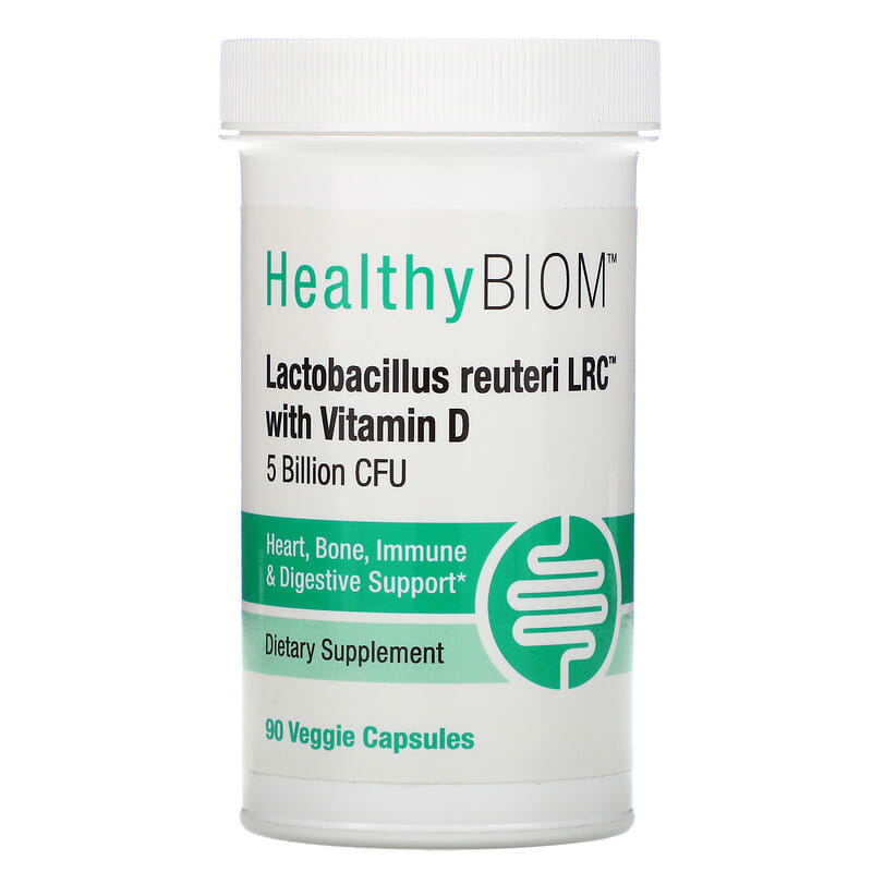 HealthyBIOM™ Lactobacillus reuteri LRC™ with Vitamin D5 Billion CFUs & Delayed Release CapsuleLactobacillus reuteri LRC™ & Vegan Vitamin DHeart, Bone, Immune & Digestive Support*Formulated Without GMOs, Soy or GlutenProduced in a Registered cGMP Compliant Facility