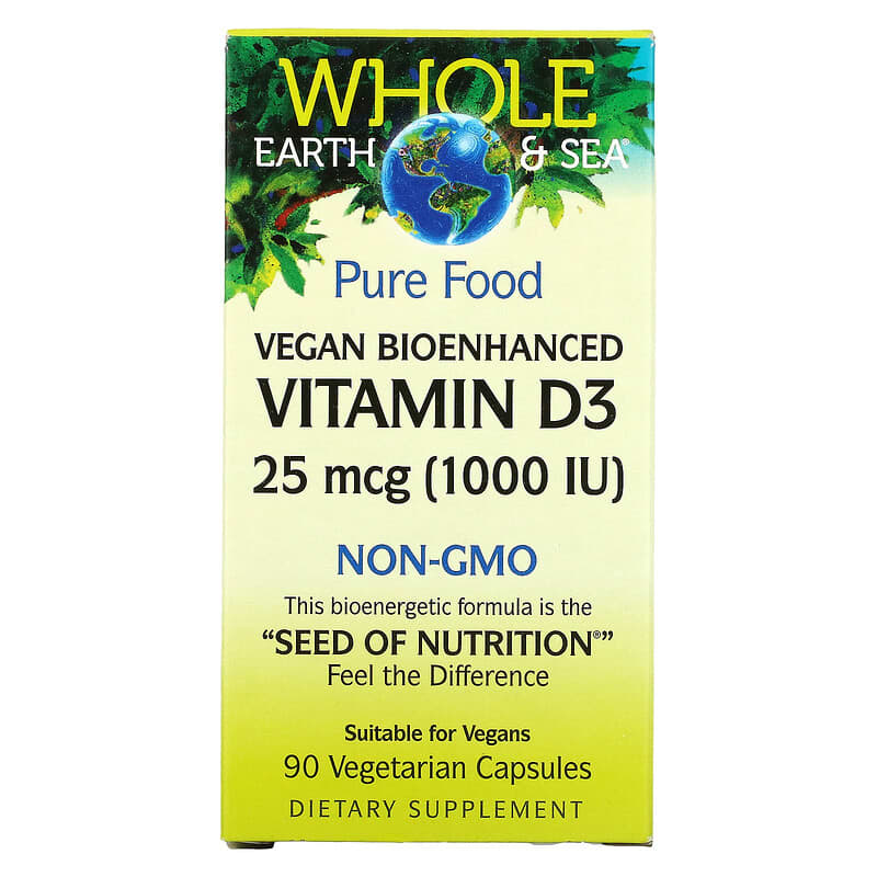 Thực phẩm bổ sung Natural Factors Whole Earth & Sea Vegan Bioenhanced Vitamin D3 25 mcg (1.000 IU) 90 Vegetarian Capsules chính hãng Natural Factors, mã vạch 068958355122, nhập khẩu từ Mỹ