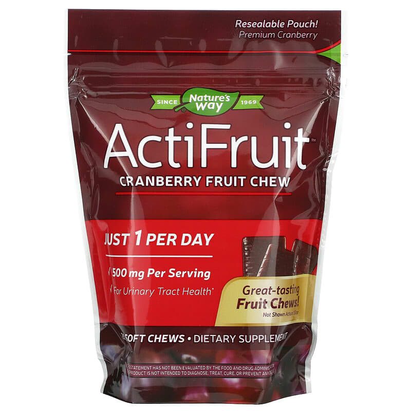Resealable Pouch!Premium CranberrySince 1969Just 1 Per Day500 mg Per ServingFor Urinary Tract HealthGreat-Tasting Fruit Chews! Dietary Supplement Experience the Cranberry Advantage ActiFruit is Made From Whole Fruit – Other Products use Only the Juice Vegetarian Gluten FreeWhat are PACs?Proanthocyanidins (PACs) are a class of flavonoids found in fruits and seeds that provide protective benefits. But not all PACs support urinary tract health. A-type PACs from cranberries provide urinary tract benefits. Cranberries contain Type-A Proanthocyanidins (PACs), which are the key actives in cranberry that support urinary tract health. ActiFruit is standardized from unique varieties of cranberries, including Early Black, which contain a higher natural potency of PACs.