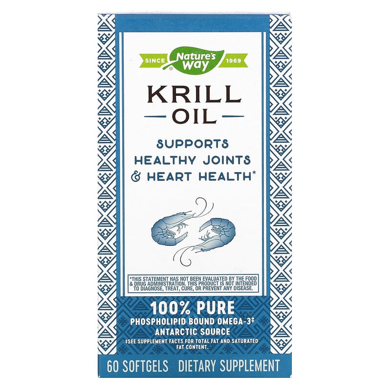 Since 1969Supports Healthy Joints & Heart Health100% Pure Phospholipid Bound Omega-3‡Antarctic Source Dietary Supplement Gluten FreeSupports Hearth HealthKrill Oil may help reduce the risk of coronary heart disease. Supportive but not conclusive research shows that consumption of EPA and DHA omega-3 fatty acids may reduce the risk of coronary heart disease‡Other BenefitsNature’s Way® Antarctic Krill Oil supports healthy joints and blood triglyceride levels already within normal range. Nature’s Way® Antarctic Krill OilKrill Oil’s omega-3 fatty acids are in optimal phospholipids form‡Smaller effective dose than fish oil makes for easier intakePurity tested for PCBs, heavy metals (including mercury), and other impuritiesNo fishy burp-back or aftertaste‡See supplement facts for total fat and saturated fat content.