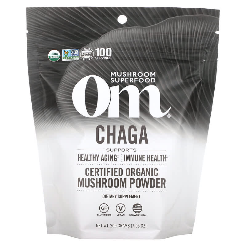 USDA OrganicNon GMO Project VerifiedOM Grown Mushroom Blend – 2, 000 mg Per ServingSupports Healthy Aging, Immune Health Dietary Supplement Gluten FreeVeganKeto FriendlyPaleo FriendlyKosherMushroom Your MicrobiomeFunctional Without Anything Funky AddedNo Nutrients Left BehindTested For Heavy MetalsComplete Transparency ID TestingCertified Organic by Organic CertifiersCertified Kosher by Earth KosherThe Superfoodie of Superfoods. Mushrooms contain many unique bioactive nutrients that can’t be found in plant or animal sources alone. Each serving of Om provides 2, 000 mg of Certified Organic Mushroom Powder Blend. CHAGAThe Mushroom of Youth. Our ancestors had it right. Lotions and potions are only half the answer. It’s what’s inside that counts. Revered for its sacred antioxidants, Chaga is a polyphenol powerhouse that helps outsmart free radical damage for healthy aging at any age. Feel youthful radiance inside and out. Now wiser feels younger. We grow our OMWe grow a diverse range of organic mushroom species at our indoor farm in California and capture the complete nutritional value of the growing cycle. Whole food mushrooms are important because they provide a full spectrum of active compounds to support optimal health. So you can bet your beta glucans they’re effective.