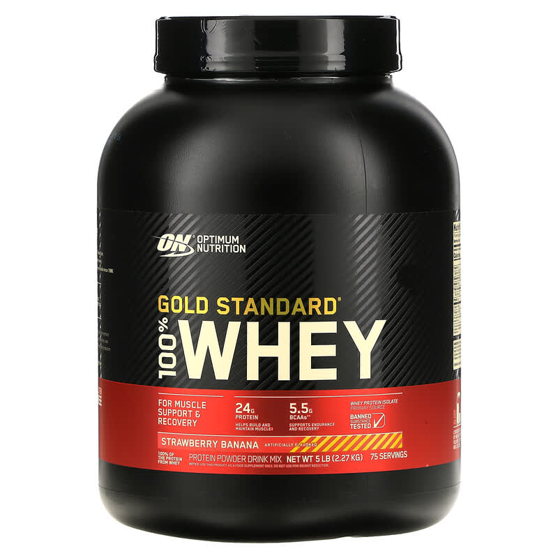 For Muscle Support & Recovery24 g Protein – Helps Build and Maintain Muscle5. 5 g BCAAs** – Supports Endurance and Recovery Whey Protein Isolates Primary SourceBanned Substance Tested Artificially Flavored 100% of the Protein From WheyProtein Powder Drink MixNo Artificial Growth Hormones^Informed Choice – We Test You Trust Gluten Free Strength Training Sports Performance Active Lifestyle Why Gold Standard 100% Whey™?Packed with 24 grams of high-quality protein per serving to help build muscle‡. Whey Protein Isolate (WPI) is the primary ingredient with further carbs and fat ‘isolated out. 11 grams of naturally occurring Essential Amino Acids (EAAs) to support muscle recovery. The GOLD STANDARD for protein quality, fueling over 2 billion workout recoveries worldwide since 1999. OPTIMUM NUTRITION® has been trusted to provide the highest quality in post-workout recovery, pre-workout energy, and on-the-go sports nutrition for over 30 years and in 99+ countries. After careful supplier selection each ingredient is tested to assure exceptional purity, potency and composition. We hold ourselves to the highest production standards, all so you can unlock your body’s full potential. GOLD STANDARD 100% WHEY™ is designed for maximum mixability and superior drinkability. ^No significant difference has been shown between milk derived from rbst-treated and non-rbst treated cows. **Naturally occurring amino acids. ‡When taken over time with regular resistance training.