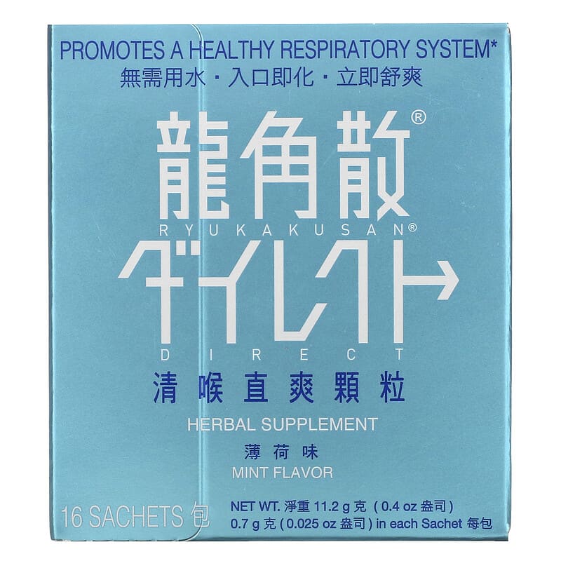 Promotes A Healthy Respiratory SystemHerbal Supplement Ryukakusan direct, Mint Flavor Herbal Supplement is a Dietary Supplement in granular form that is to be taken without water. It dissolves instantly inside your mouth. It may be used whenever and wherever desired. One sachet is ideal for one adult use, but the product can be taken by everyone, starting with children three years of age (see Suggested Use). Stimulates the secretion of mucus from the inner surface of the trachea, invigorates the cilia to remove sputum, and therefore promotes a healthy respiratory system.