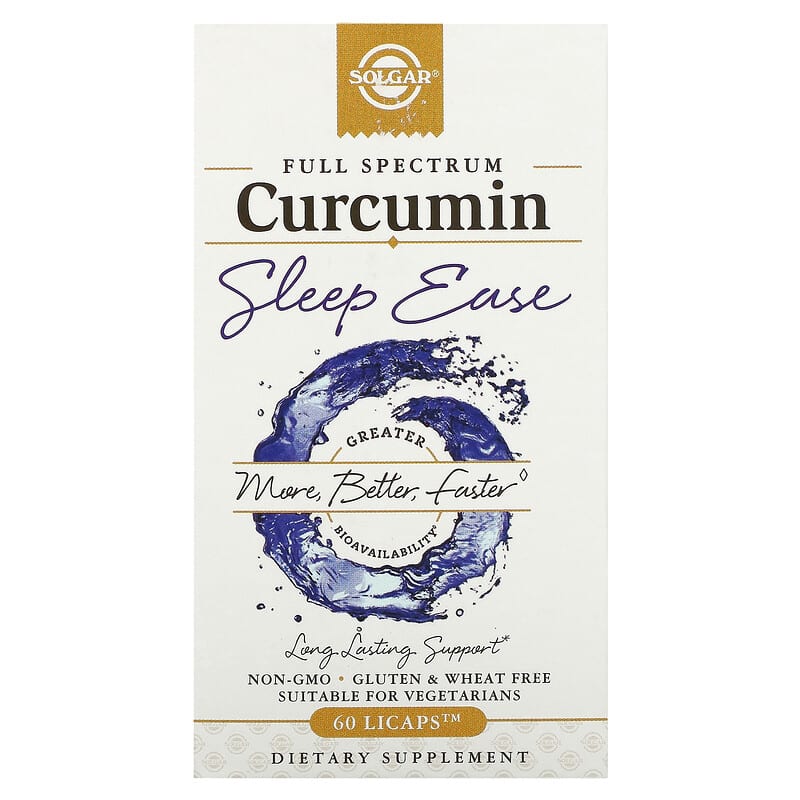 Greater Bioavailability More, Better, Faster Long Lasting SupportNon-GMOGluten & Wheat FreeSuitable for Vegetarians Dietary Supplement More, better, faster… that’s the difference of Solgar® Full Spectrum Curcumin. In fat, its absorption and bioavailability reach levels never achieved before. Solgar® transforms poorly absorbed curcumin from a fat-soluble to a water-soluble phytonutrient… making it immediately body-ready, faster absorbed and more active than ever before. Now, Solgar® Full Spectrum Sleep Ease combines that power of Full Spectrum Curcumin with PharmaGABA® to quickly restore mental calmness, Venetron® and melatonin to help with occasional sleeplessness… so you fall asleep faster and stay asleep longer. Taken at night, GABA supports relaxation and melatonin supports calm, tranquil rest, while body-ready curcumin delivers turmeric’s comforting antioxidant benefits. Oxidative stress can result from excess free radical product, and an excess of free radicals has been associated with joint discomfort. All in all, you wake up in the morning feeling renewed and refreshed. Now, Solgar® changes what you believed was possible from a sleep formula. Solgar® Sleep Ease Full Spectrum Curcumin… two Liquid Extract capsules, once at night… a good night’s sleep can now be that comfortable. Body Ready Makes the DifferenceOne of the challenges with curcumin… there’s a limit to how much your body can absorb and actually use. If absorption goes up, greater levels of active curcumin can work across multiple pathways to deliver antioxidant benefits. Finally, Solgar® takes bioavailability and absorption to a whole new level. Unlike regular turmeric powder, Solgar® starts with a 95% curcumin extract…. the standardized active form, purified and concentrated from native turmeric root (Curcuma longa). For the first time, Solgar® surrounds and encapsulates standardized curcumin extract with microscopic, “water-loving” spheres called micelles. Micelles make the difference in absorption and are so microscopically small that they allow curcumin to be readily passed into the bloodstream. At this size, micelles are virtually invisible and have the ability to transforms a dense and opaque powder into a crystal clear, body-ready liquid. The clearer the liquid… the greater the absorption. The greater the absorption… the greater the bioavailability. And, the greater the bioavailability… the greater the power of curcumin. Faster absorbed, better absorbed, and longer lasting than ever before – Full Spectrum Curcumin Sleep Ease. More… Better… Faster . These statements are based on a human study of NovaSOL® curcumin in comparison with native curcumin extract, using an objective measure (metabolite analysis).