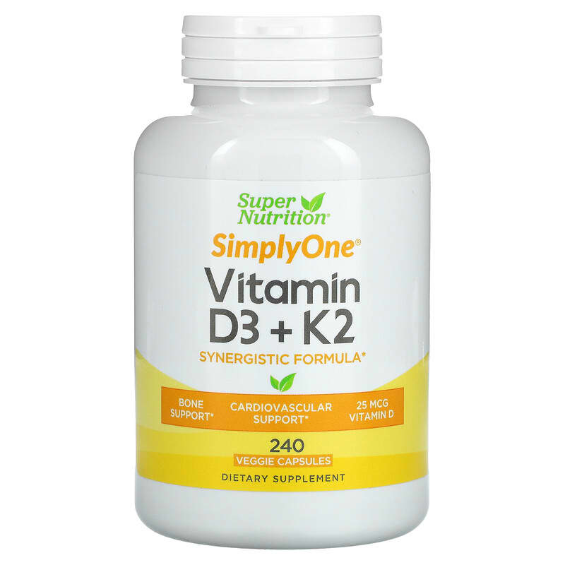 Super Nutrition SimplyOne Vitamin D3 + K2, 240 Veggie CapsulesFeaturing a Blend of Vitamin D3 and K2Bone and Cardiovascular Support*Synergistic Formula*Formulated without Gluten, GMOs, or SoyScientifically-Developed Dietary Supplement