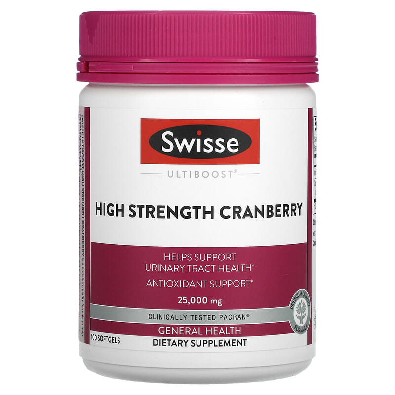 Helps Support Urinary Tract HealthAntioxidant SupportClinically Tested PACRAN® – Premium Quality FormulaGeneral Health Dietary Supplement Swisse Ultiboost High Strength Cranberry is a premium quality formula to help support urinary tract health. Clinically Tested: Contains PACran®, a clinically trialed cranberry that is a unique powdered form of the whole cranberry fruit. Urinary Tract Health: PACran® may help support the health of the urinary tract. Antioxidant Support: Cranberries are high in antioxidants, which help protect against potential free radical damage. Swisse Ultiboost High Strength Cranberry has been formulated based on scientific evidence to provide a high strength dose of cranberry in one convenient softgel.