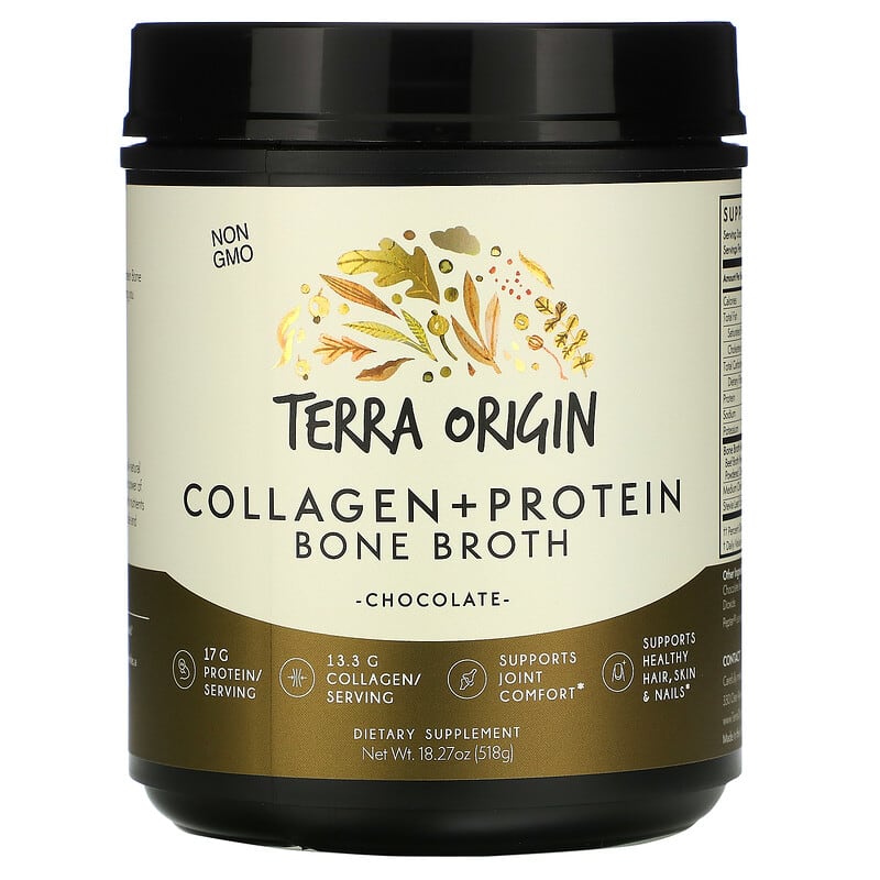 Non GMO17 g Protein/Serving13. 3 g Collagen/ServingSupports Joint ComfortSupports Healthy Hair, Skin & Nails Dietary Supplement Contains types I and III collagen from real whole food sources. Collagen + Protein Bone Broth also contains important nutrient cofactors found in real bone broth, giving you delicious flavor along with vital ingredients to improve your health. At Terra Origin, we seek to improve the mind and body’s well-being with all-natural and effective, scientifically studied ingredients. Terra Origin believes in the power of this combination to improve one’s overall health and restore balance to life, with nutrients both of the earth and created within it. Our supplements promote a better inside and outside, giving you the power to live life as the best version of yourself. BenefitsMade with Collagen for Joint Support. 17 grams protein per serving from chicken, beef and turkey. 3 grams carbs. Supports joint comfort, flexibility and cartilage health. Supports healthy hair, skin and nails. Source of medium chain triglycerides, a powerhouse of sustained energy fuel during exercise.