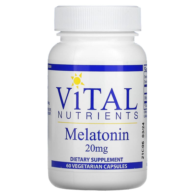 Thực phẩm bổ sung Vital Nutrients Melatonin 20 mg 60 Vegetarian Capsules chính hãng Vital Nutrients, mã vạch 693465419113, nhập khẩu từ Mỹ