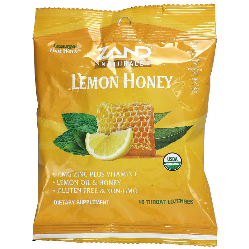 Thực phẩm bổ sung Zand Naturals Organic Lemon Honey 18 Throat Lozenges chính hãng Zand, mã vạch 041954000074, nhập khẩu từ Mỹ